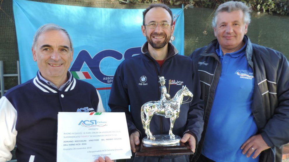 Con la premiazione del miglior ciclista Acsi dell’anno 2016, nella persona di Adriano Nocciolini, è stato portato a termine l’ultimo atto dell’annata ciclistica Acsi di Grosseto. Un anno di intensa attività sportiva documentata da oltre 30 manifestazioni svoltesi nell’intera Provincia di Grosseto. Un grazie di cuore va rivolto a quelle squadre che si sono distinte nell’organizzazione ed a tutte le altre affiliate che con i loro tesserati hanno partecipato numerose agli eventi. Un mese circa di pausa per poi ricominciare alla grande già dal mese di gennaio con la seconda edizione del Championship Winter Road. Adriano Nocciolini del Team Marathon Bike si è aggiudicato con 103 punti il premio, consistente in un buono spesa del valore di 200 euro, offerto dal Comitato Provinciale Acsi Ciclismo, avendo avuto la meglio su altri due compagni di squadra Giorgio Cosimi (che ha concluso la stagione con 83 punti) e Raffaele Caselli (82 punti). Ad Adriano Nocciolini i complimenti del Responsabile Provinciale Fabrizio Montomoli anche a nome di tutto il Comitato e del Coordinatore Regionale Acsi Mario Panico