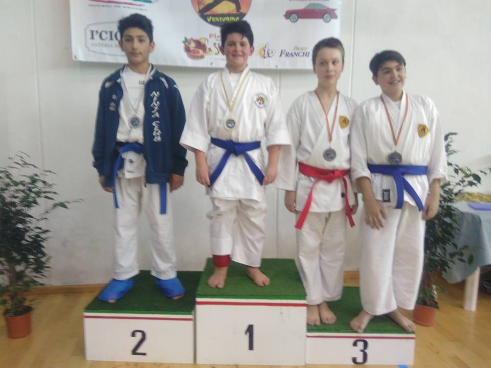 Gabriele Giustarini è medaglia d’argento nel Kata, Nabil Abdelbari terzo posto e bronzo nel Kata, Cristian Musolino terzo su quattordici nel Kata. I più grandicelli Della Monaca (10 anni) e Trillocco (11 anni) si sono distinti nelle categorie “Esordienti A” dove hanno raggiunto le finali nel Kata con Trillocco al quarto posto e Della Monaca dopo un errore arbitrale ed uno spareggio con il primo classificato non ha vinto per un soffio.