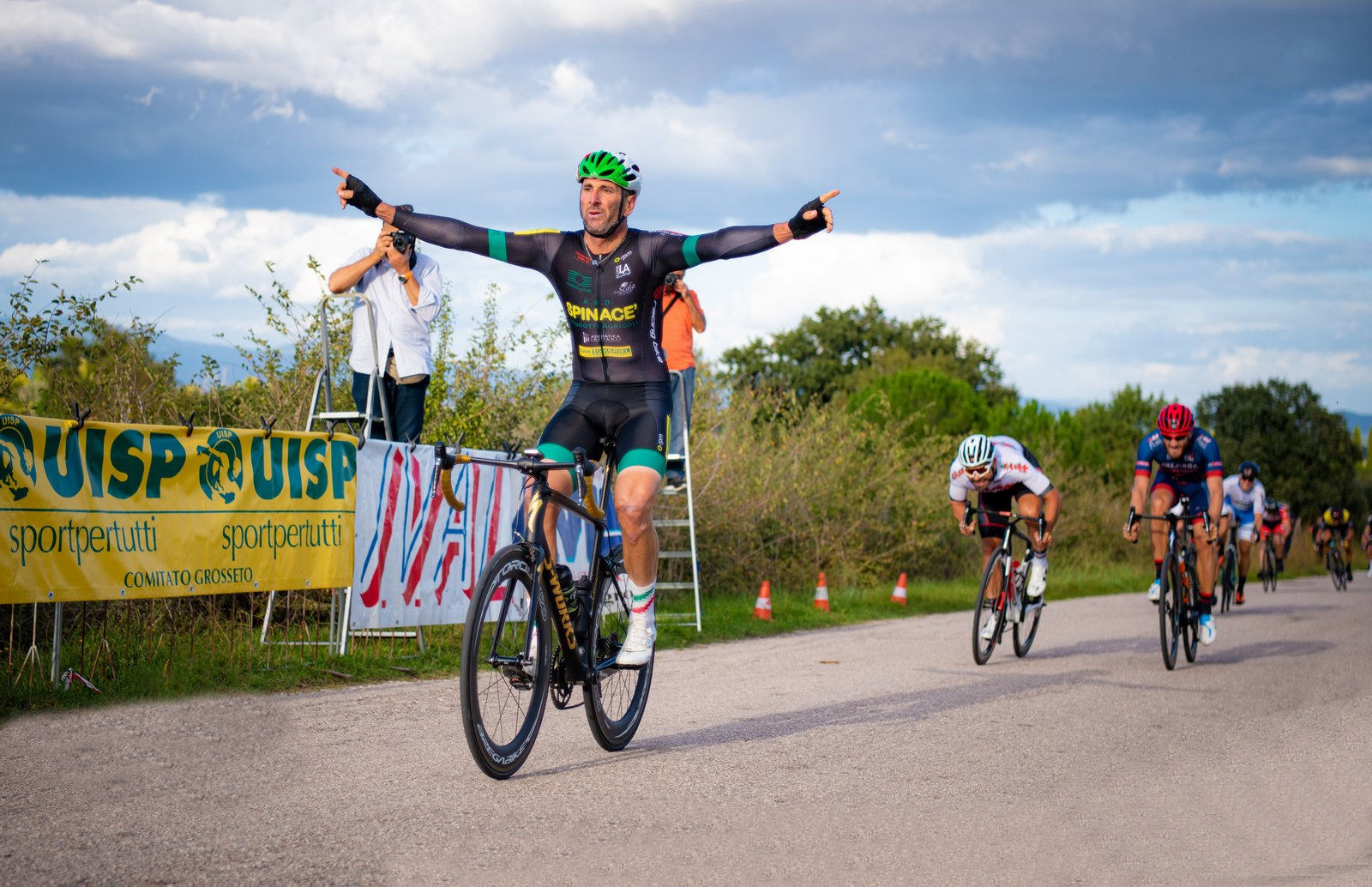 Uno strepitoso Gianmarco Agostini vince il primo trofeo “Val di Campo” andato in scena mercoledì pomeriggio al Bozzone di Vetulonia, interrompendo così il tris di vittorie del castiglionese Adriano Nocciolini ottenute nelle ultime gara infrasettimanali. La manifestazione di ciclismo amatoriale è stata organizzata dal Marathon Bike, Uisp e Avis Grosseto , con il patrocinio del Comune di Castiglione della Pescaia e Provincia di Grosseto, supportata dà Banca Tema e dalla carrozzeria Car Senter. Cala il sipario sull’ultima gara organizzata nel ciclismo dal Marathon Bike di quest’anno, con la strepitosa volata del fortissimo atleta di Castelfranco Veneto che gli ha permesso di arrivare a braccia alzate sul traguardo posto in località Paesetto dopo 65 chilometri di corsa. Il più volte campione italiano Agostini, con un palmares decisamente importante dove spicca la partecipazione alle Olimpiadi di Barcellona, ha regolato una quindicina di corridori dei 61 che si sono presentati al via tra i quali i campioni Andrea Tafi e l’ex calciatore della Juventus, Fabrizio Ravanelli. Il percorso prevedeva sette giri sotto gli abitati di Buriano e Vetulonia. Entrando nel merito della corsa, protagonisti della gara sono stati senza ombra di dubbio Alessio Minelli e Dini Diego. Infatti sono stati proprio loro che al culmine del secondo giro a promuovere la fuga più importante. Nonostante l’accordo totale tra i tre fuggitivi, (dentro alla fuga anche Federico Del Guasta) sulla spinta soprattutto di Andrea Tafi e il vincitore Agostini i tre a 18 chilometri dall’arrivo venivano ripresi da una quindicina di corridori con dentro, oltre ai nominati Tafi e Agostini, Sergio Zaottini, Federico Bartalucci, Stefano Degl’Innocenti, Michele Scalabrelli, Enzo Rossi, Fabio Alberi, Vincenzo Rigirozzo, Lucio Margheriti, Cesare Marocco, e Fabio Orcame. Una volata imperiosa (foto Roberto Malarby) come detto del “killer”, così viene chiamato da queste parti, tesserato con la squadra di Treviso Spinacè Zaghis, non lasciava scampo ai compagni di fuga. Questi i vincitori delle rispettive categorie: Federico Bartalucci, Alessio Minelli, Fabio Orcame, Sergio Zaottini, Vincenzo Rigirozzo, Fabio Alberi, Massimo Sottili, e Massimo Lari.