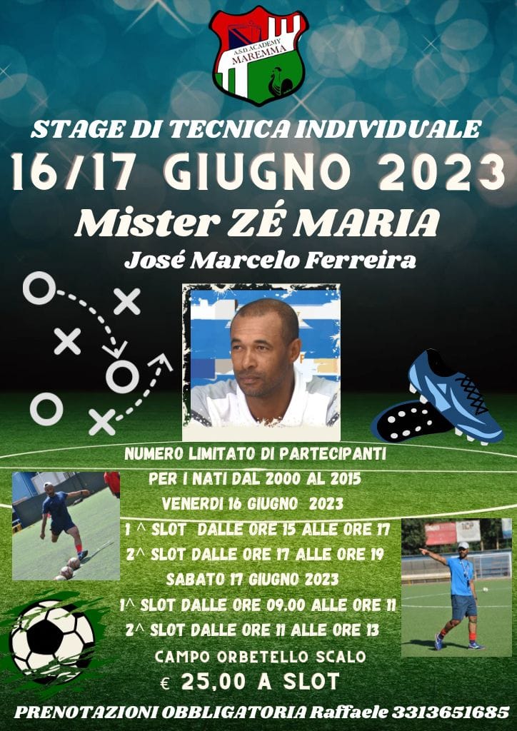 ORBETELLO – Nelle giornate del 16 e 17 giugno , presso l’impianto sportivo di Orbetello Scalo si svolgeranno stage di tecnica individuale con mister Ze Maria. L’ex calciatore brasiliano che attualmente fa l’allenatore ed è nell’area tecnica del Parma è stato coinvolto grazie anche all’intervento di Diego Di Chiara. Tra le tante squadre dove Ze Maria ha militato, le più significative sono il Flamengo, il Perugia, Parma e Inter con cui tra il 2004 e il 2006 ha vinto due Coppa Italia, una super coppa e uno scudetto.