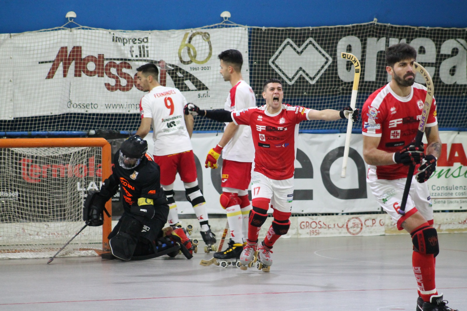 E’ stata una serata magica, iniziata con un preciso passaggio di Paghi a Franchi, che aggira il portiere e mette in rete. L’Edilfox insiste, ma i lombardi pareggiano con una veloce azione di contropiede: l’ex Fantozzi serve Najera che dalla sinistra batte Català. Passano solo 28 secondi e il Grosseto trova il 2-1, grazie a un missile da lontano di Thiel che s’infila alla destra del portiere ospite. Prima della fine del tempo c’è stato un botta e risposta tra Grosseto e Lodi, nel giro di sei secondi: De Oro mette in rete un servizio di Saavedra, mentre Nadini accorcia con un’azione personale di Nadini. La supersfida, che ha richiamato un buon pubblico, torna in parità dopo settanta secondi della ripresa, con il tiro dalla destra di Fernandes che beffa Català. Al 10′ Lodi va addirittura in vantaggio con una bella rete di Fantozzi che supera Català con un alza e schiaccia pregevole sotto porta. Il Grosseto aumenta la pressione alla ricerca del pareggio, ma si espone al veloce contropiede dei giallorossi ospiti. Gli sforzi del Circolo Pattinatori vengono premiati al 16′: Paghi serve Francbi che con un diagonale imparabile per Grimalt.