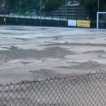 PORTO SANTO STEFANO. Il match valido per il campionato juniores provinciali tra l’Argentario e l’Alta Maremma, come è evidente dalla foto in alto, è stato sospeso per il diluvio e la forte grandine caduta in campo.