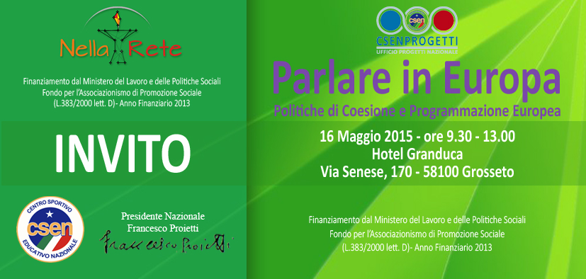 A tal fine nell’ambito delle azioni del progetto, il comitato Csen di Grosseto ha previsto un seminario dal titolo “Parlare in Europa -Politiche di Coesione e Programmazione Europea”, il quale si terrà il giorno sabato 16 maggio a Grosseto dalle 9.30 alle 13.00, presso l’Hotel Granduca in via Senese, 170 .