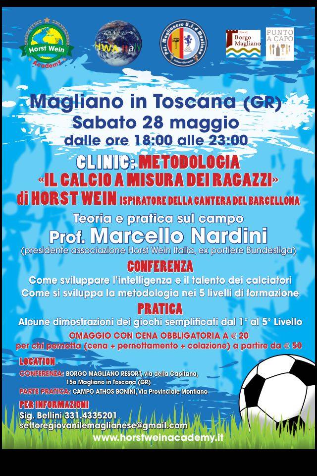 GROSSETO. Pregevole iniziativa, organizzata dal settore giovanile Polisportiva Maglianese ed Usd Montiano in collaborazione con Clinic, sulla metodologia: ” Il calcio a misura dei ragazzi di Horst Wein” con la Horst Wein Academy rappresentata dal Prof.Marcello Nardini.