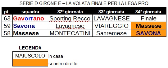 Grosseto Nel girone E di Serie D mancano 270′ al termine del campionato. Dunque, tre sole partite e finalmente conosceremo chi tra Gavorrano, Savona e Massese andrà in Lega Pro. A quel punto, le “sconfitte” dovranno leccarsi le ferite e prepararsi in vista dei play-off. Nel frattempo, vediamo cosa riserva il calendario alle tre squadre in lotta per la promozione. A tal proposito, vi proponiamo una griglia riassuntiva e un’analisi più dettagliata.