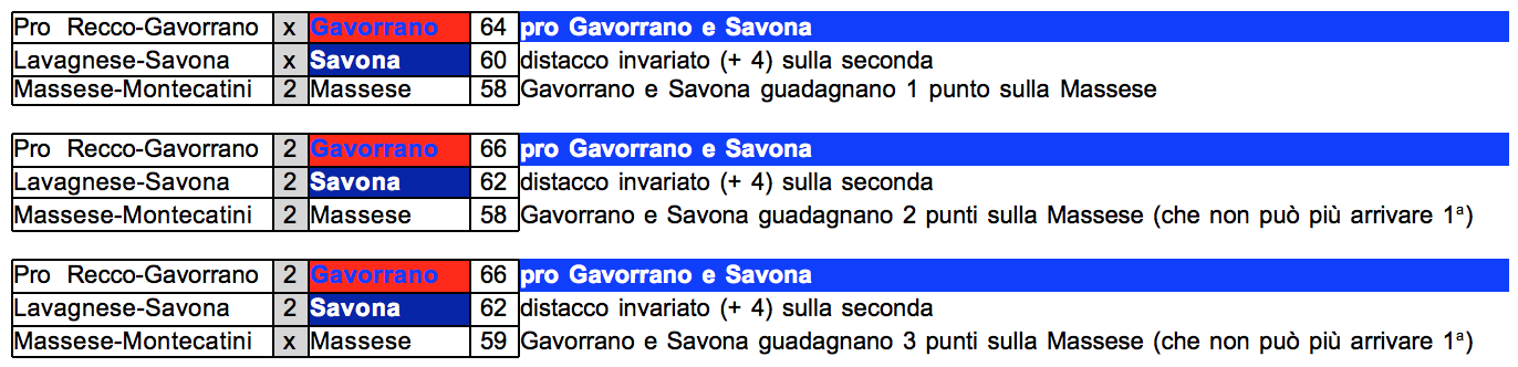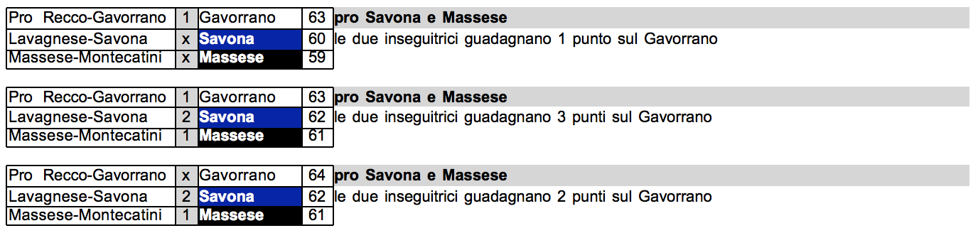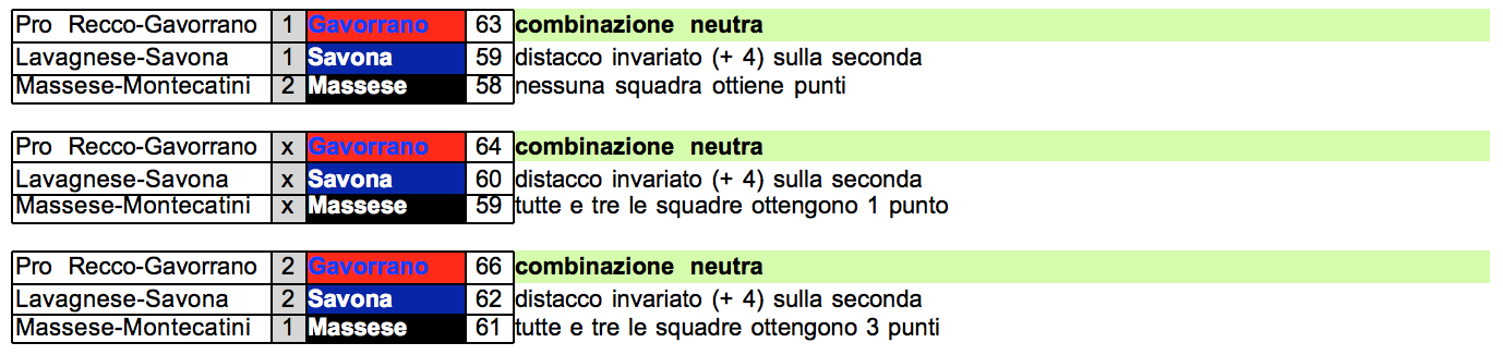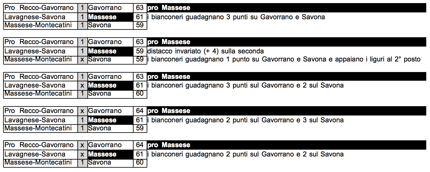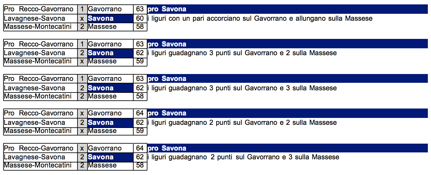 Si tratta di qualsiasi risultato migliore rispetto al Gavorrano ottenuto congiuntamente dalla Massese e dal Savona.