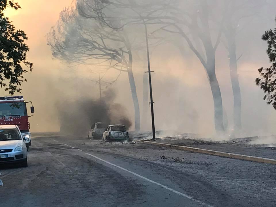 Almeno tre auto parcheggiate nella pineta sono andate a fuoco nonostante l’intervento immediato dei vigili del fuoco.