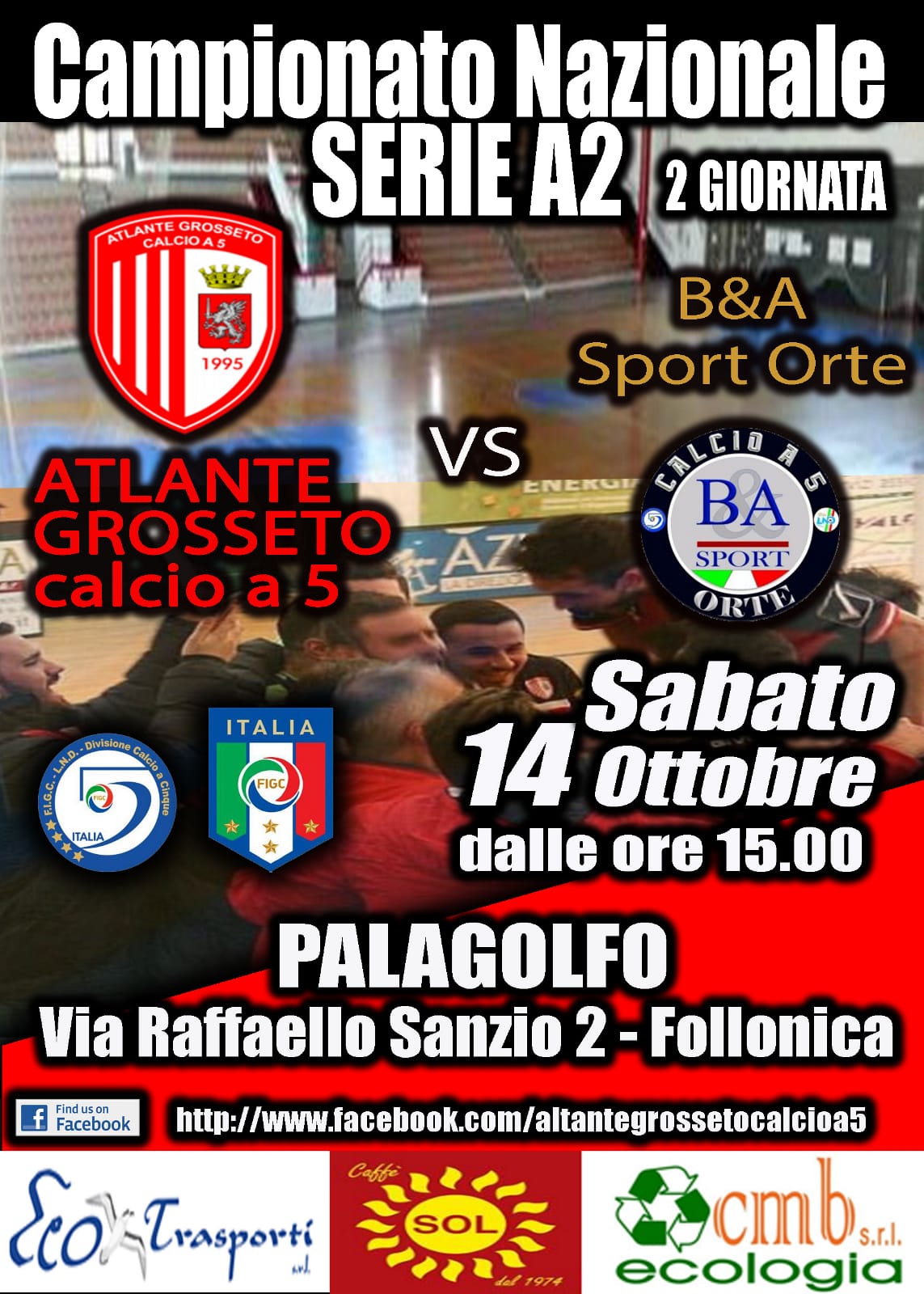 Grosseto. In diretta dal Palagolfo di Follonica la diretta streaming sulla nostra pagina Facebook del match valevole per la seconda giornata del campionato di Serie A2 di calcio a 5 tra i biancorossi dell’Altante Grosseto ed il B & A Sport Orte. Immagini e cronaca di Franco Ciardi e Fabio Lubrani.