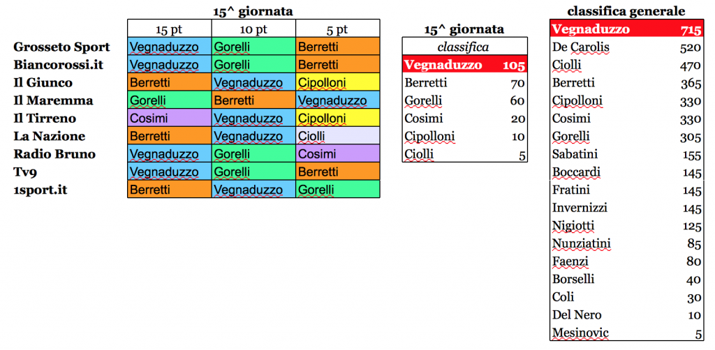 Grosseto Nell’ultimo turno d’andata del girone A d’Eccellenza regionale, il Grosseto ha battuto 2 a 0 il Gambassi Terme e la stampa locale ha premiato Vegnaduzzo quale miglior biancorosso di tale giornata (la 15ª). Per il bomber argentino, salito a quota 11 reti in campionato (vice-capocannoniere del girone A), 105 punti nella classifica settimanale del Biancorosso dell’anno e leadership assoluta rinforzata. Ora Vegnaduzzo è arrivato a 715 punti totali. Staccato, a quota 520, c’è De Carolis (pure espulso), mentre Ciolli, terzo assoluto, domenica ha raccolto 5 punti ed è giunto a 470. Premiati anche Berretti e Gorelli, rispettivamente con 70 e 60 punti. Per Berretti, grosso balzo in classifica su Cipolloni e Cosimi e quarto posto assoluto con 365 punti. Al quinto posto, invece, con 330 punti, troviamo Cipolloni e Cosimi, che contro il Gambassi hanno ricevuto 10 e 5 punti. Altro balzo importante è stato quello di Gorelli, visto che è sempre settimo, ma con i suoi 305 punti totali adesso vede Cosimi e Gorelli a sole 25 lunghezze.