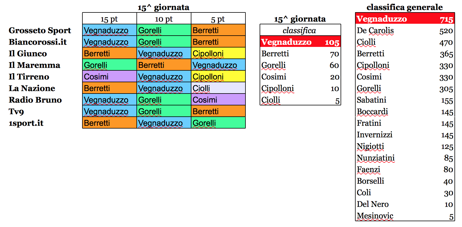 Grosseto Nell’ultimo turno d’andata del girone A d’Eccellenza regionale, il Grosseto ha battuto 2 a 0 il Gambassi Terme e la stampa locale ha premiato Vegnaduzzo quale miglior biancorosso di tale giornata (la 15ª). Per il bomber argentino, salito a quota 11 reti in campionato (vice-capocannoniere del girone A), 105 punti nella classifica settimanale del Biancorosso dell’anno e leadership assoluta rinforzata. Ora Vegnaduzzo è arrivato a 715 punti totali. Staccato, a quota 520, c’è De Carolis (pure espulso), mentre Ciolli, terzo assoluto, domenica ha raccolto 5 punti ed è giunto a 470. Premiati anche Berretti e Gorelli, rispettivamente con 70 e 60 punti. Per Berretti, grosso balzo in classifica su Cipolloni e Cosimi e quarto posto assoluto con 365 punti. Al quinto posto, invece, con 330 punti, troviamo Cipolloni e Cosimi, che contro il Gambassi hanno ricevuto 10 e 5 punti. Altro balzo importante è stato quello di Gorelli, visto che è sempre settimo, ma con i suoi 305 punti totali adesso vede Cosimi e Gorelli a sole 25 lunghezze.
