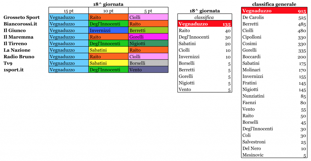 Grosseto Nella 18ª giornata del girone A d’Eccellenza regionale, il Grosseto è stato costretto a subire un deludente pareggio per 2 a 2 contro il Marina La Portuale a causa dei due contestatissimi rigori assegnati ai lunigiani dall’arbitro Prela, l’ultimo dei quali al 92′. Dunque, a nulla sono valse le splendide realizzazioni di bomber Vegnaduzzo, autore di una doppietta e capocannoniere del girone A con 14 reti insieme ad Andreotti della Cuoiopelli. Un rendimento realizzativo altissimo e un riconoscimento anche da parte della stampa grossetana nell’ambito del premio Biancorosso dell’anno, dove l’argentino ha fatto il pieno ottenendo 130 punti su 130. Chiaramente, oltre a trionfare nel turno settimanale, l’attaccante sudamericano ha allungato su tutti anche nella classifica generale, dove è giunto a 915 punti. Dietro di lui il vuoto, con De Carolis a 525 punti, mentre Berretti è sempre terzo a 485 e Ciolli quarto a 480. Insomma, il vero e proprio plebiscito ottenuto da Vegnaduzzo ha lasciato le briciole ai compagni. Il secondo della settimana, ad esempio, è stato Raito, con 40 punti, mentre terzo Degl’Innocenti con 30. Per Raito il totale è salito a 55 punti, invece per Degl’Innocenti si tratta dell’ingresso ufficiale in classifica. Altri che hanno ottenuto punti nel 18° turno sono stati Ciolli e Invernizzi, 10 a testa, mentre 5 per uno li hanno ricevuti Borselli, Berretti, Gorelli, Nigiotti e Vento. In totale, sono stati 11 i giocatori unionisti votati nell’ultimo turno, anche questo un record stagionale assieme ai 130 punti di Vegnaduzzo.