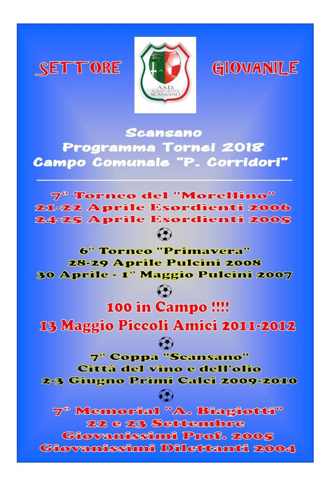Il 13 maggio sarà la volta di “100 in campo” con i piccoli amici 2011-2012 per passare alla “Settima Coppa Scansano” dal 2 a 3 giugno per i Primi Calci.