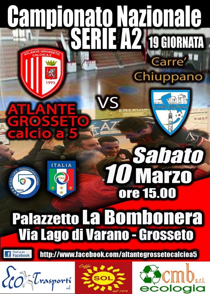 Grosseto. Questo pomeriggio con inizio alle ore 15 trasmetteremo in diretta streaming il match del campionato di calcio a 5, serie A2, tra l’Atlante Grosseto ed il Carrè Chiuppano.