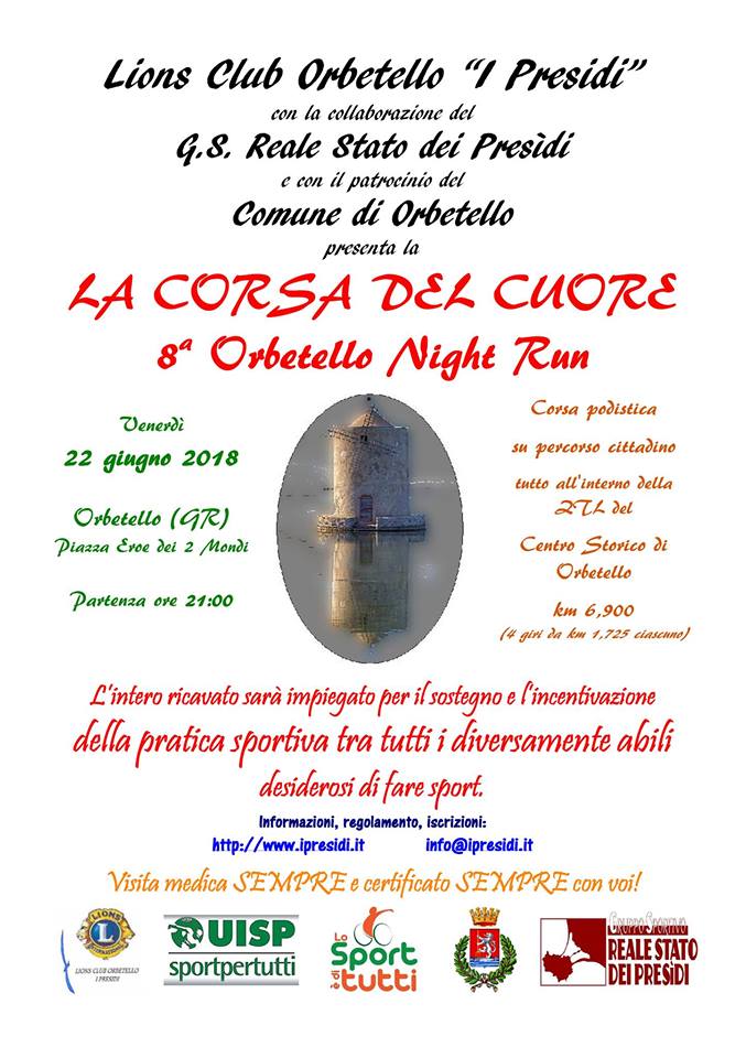 Dopo il successo della passata edizione torna stasera l’Orbetello Night Run. Alle 21 scatterà l’ottava edizione della suggestiva gara podistica in notturna per le vie del centro storico orbetellano, ormai ribattezzata “La Corsa del Cuore”, perché abbina sport e solidarietà. Quest’anno l’evento servirà a raccogliere fondi da destinare al sostegno e per l’incentivazione della pratica sportiva tra tutti i diversamente abili desiderosi di fare sport. Sei chilometri e novecento metri di percorso, con 4 giri del centro storico per un evento portato avanti dal gruppo sportivo Reale Stato dei Presidi in collaborazione con il Lions Club “I Presidi” di Orbetello. Si tratta di una gara particolarmente affascinante, visto che Orbetello di sera ha sempre il suo fascino. Non è previsto invece il pacco gara per gli iscritti, ma solo un semplice, significativo ricordo di partecipazione. L’appuntamento è per stasera alle 19 in piazza Giovanni Paolo II per le formalità di rito. Partenza alle 21 ed arrivo in piazza Eroe dei Due Mondi a conclusione dei mitici quattro giri del circuito cittadino. Al termine della gara cerimonia di premiazione e ricco ristoro finale in piazza Giovanni Paolo II a pochi metri dall’arrivo.