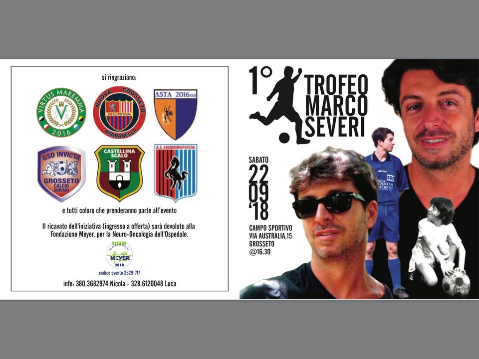Sabato 22 sarà ricordato Marco Severi. Il grossetano, ex calciatore dilettante scomparso lo scorso dicembre, ha lasciato in tutti i suoi ex compagni e tutti quelli che lo conoscevano un vuoto enorme. Severi, scomparso nel dicembre del 2017 dopo una malattia, sarà ricordato con un torneo in suo onore: il primo Trofeo Marco Severi, che si svolgerà sabato 22 sul campo di via Australia a Grosseto, con la collaborazione della Nuova Grosseto Barbanella. Il torneo vedrà la partecipazione di squadre giovanili, con la partecipazione di sei società, legate a Marco Severi, in quanto in tali squadre ha militato nella sua prolifica carriera da attaccante. Le società partecipanti sono: Virtus Maremma 2016, Nuova Grosseto Barbanella, Asta 2016, Invicta Grosseto, Castellina Scalo e Saurorispescia. La manifestazione avrà inizio alle 16.30 e vedrà le squadri giovanili confrontarsi in due gironi da tre squadre per poi vedere le migliori incontrarsi in finale intorno alle 18.30. Tale evento è ad ingresso libero con eventuale offerta volontaria che sarà devoluta alla Fondazione Meyer per la Neuro-Oncologia.