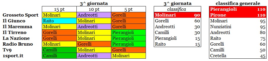 Grosseto Nella 3a giornata del premio della stampa, Biancorosso dell’anno, il più votato è stato il giovane attaccante Schoon Molinari, ormai ribattezzato il Cobra, autore del gol vittoria allo scadere del recupero di Castelnuovo-Grosseto di sabato scorso. Molinari ha raccolto 90 punti e ha preceduto Gorelli, fermatosi a 60, autore a sua volta della rete in rovesciata che è valsa il pari momentaneo. Terzi, ad ex-aequo, Camilli e Pierangioli, premiati con 30 punti, mentre 15 ne hanno ricevuti sia Raito che Pierangioli. Proprio quest’ultimo, è il nuovo leader in classifica generale, appaiato, però, a Pirone, fermo a 110 punti. Molinari, invece, ha compiuto un balzo importante e dall’ultimo posto adesso è terzo insieme a Nunziatini a quota 95. Dietro di loro, Andreotti a 80, Raito a 75, Gorelli a 60, Camilli a 50 e Cretella a 45.