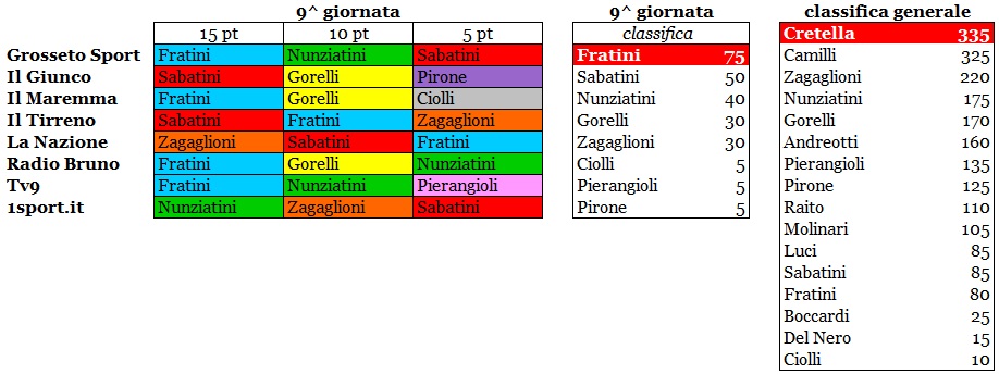 Grosseto La 9ª giornata del campionato di Eccellenza ha regalato il successo esterno dei biancorossi sul San Miniato Basso attraverso un primo tempo autoritario e una ripresa dove gli unionisti hanno controllato un buon avversario. Nunziatini, poi, con la sua parata al 93′ sul colpo di testa ravvicinato di Pellegrini, ha blindato un successo davvero meritato. Come spesso succede in caso di vittoria, hanno brillato molti giocatori unionisti, per questo la stampa grossetana si è un po’ divisa nell’indicare i migliori per il premio Biancorosso dell’anno. La riprova è che hanno ricevuto punti ben otto calciatori rispetto ai cinque delle settimana scorsa. Il migliore della 9ª giornata è risultato essere Fratini che ha ottenuto 75 punti e ha guadagnato anche tre posti in classifica generale, dove non è più ultimo, ma tredicesimo. Come secondo settimanale, invece, è giunto Sabatini, che ha ricevuto 50 punti con i quali ha agganciato all’undicesimo posto Luci, fermo a quota 85. Quarto e quinto posto, poi, sono andati a Nunziatini con 40 punti e alla coppia Gorelli-Zagaglioni con 30. In pratica, Zagaglioni, terzo in classifica generale a quota 220, ha guadagnato 30 punti su Cretella e Camilli (ancora primo e secondo), mentre ne ha persi 10 con Nunziatini, ora quarto assoluto a 175. Al quinto posto assoluto, invece, appena 5 punti sotto Nunziatini, troviamo Gorelli, il gigante difensivo che domenica si è procurato il rigore decisivo poi trasformato da Pierangioli. Dati alla mano, Andreotti (rientrato nel secondo tempo a Ponte a Egola) è stato scavalcato in classifica generale anche da Nunziatini e Gorelli e adesso è sesto. Infine, hanno ricevuto 5 punti a testa il capitano unionista Ciolli, il match-winner Pierangioli e il fantasista Pirone.