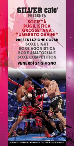 Grosseto Venerdì 21 giugno, alle ore 19.30, la societa Pugilistica Grossetana “Umberto Cavini” presieduta dal presidente Fabrizio Corsini presenterà uno stage di pugilato a Follonica, al Silver Cafè di via Dante Alighieri 2.