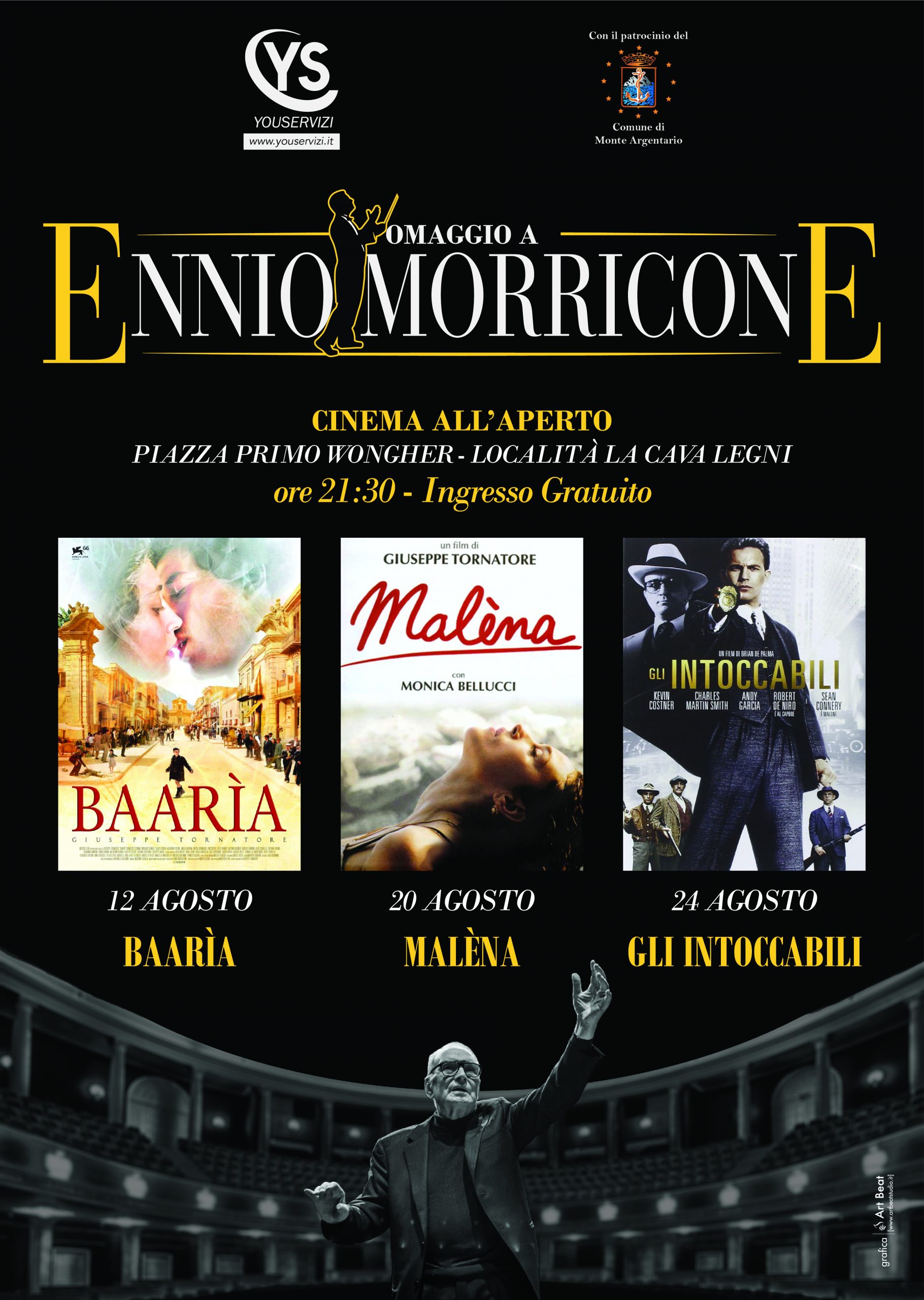 La seconda rassegna cinematografica si terrà nella piazza Primo Wongher in località La Cava a Porto S.Stefano. In questa occasione il Comune ha voluto rendere omaggio ad Ennio Morricone il compositore recentemente scomparso che ha firmato le colonne sonore più belle del cinema italiano e mondiale. A lui saranno dedicate le tre serate del 12, 20 e 24 agosto in cui saranno proiettati rispettivamente : BaariaMalenaGli incoccabili. Le proiezioni avranno inzio alle ore 21,30.