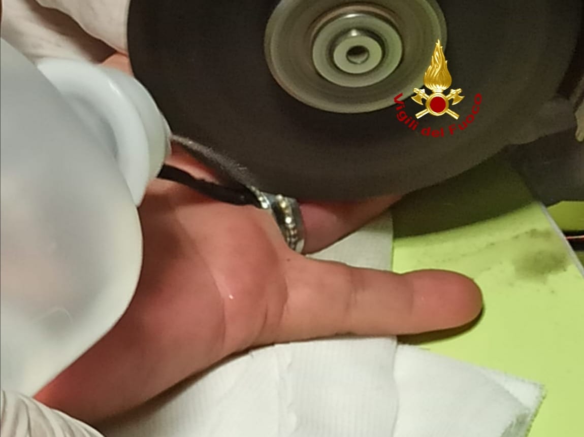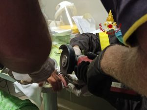 Il personale VF, coadiuvato dal personale medico del pronto soccorso, con molta calma e particolare attenzione, ha lavorato con un frullino per incidere e tagliare l’anello in due punti.