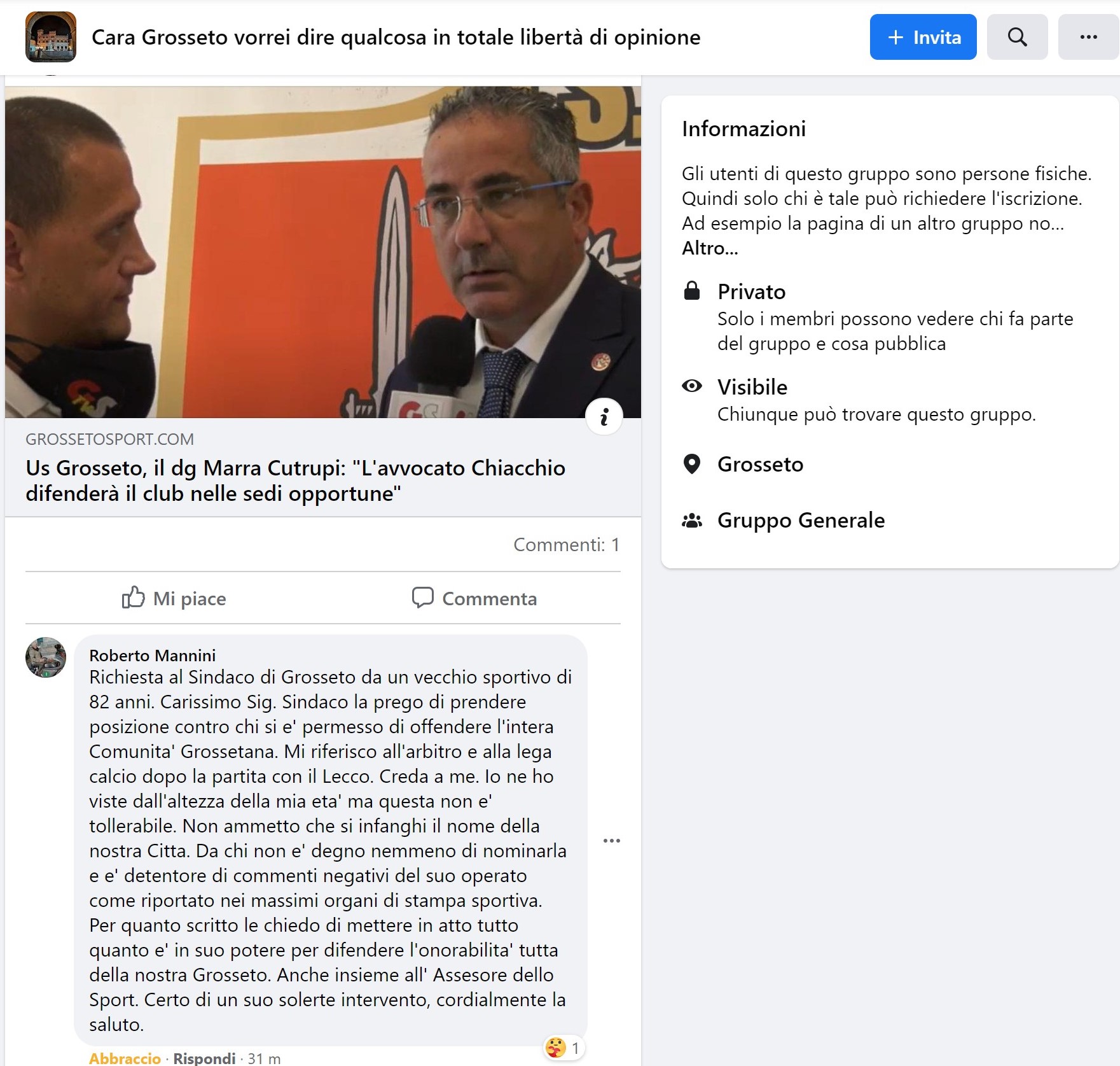 Grosseto Un noto sportivo grossetano, Roberto Mannini, classe 1938, memoria storica cittadina, per tanti anni massaggiatore dell’Us Grosseto, ma anche ex-pugile e altro ancora, ha scritto un accorato messaggio al sindaco Vivarelli Colonna. Una vera e propria lettera aperta al primo cittadino in un post usato per commentare un nostro articolo presente nel gruppo Facebook “Cara Grosseto vorrei dire qualcosa in totale libertà di opinione“. Il motivo dell’appello è semplice: l’arbitro di Us Grosseto-Lecco, Francesco Carrione di Castellammare di Stabia, stando a quanto dichiarato dal club biancorosso, al termine della partita avrebbe pesantemente offeso la nostra città, definendola di <<merda>>. Un fatto che ha scaldato gli animi già esacerbati per la condotta di gara del predetto arbitro, accusato di aver commesso errori gravi, costati la sconfitta al Grosseto. A questo si aggiunga la “mazzata” del giudice sportivo che proprio oggi ha sanzionato l’Us Grosseto con una multa di 10 mila euro, oltre alla squalifica per tre giornate dell’allenatore biancorosso, Lamberto Magrini e all’inibizione fino al 28 febbraio 2021 del presidente Mario Ceri. Insomma, questo è il contesto nel quale è nata la richiesta di Mannini al sindaco Vivarelli Colonna di tutelare il buon nome di Grosseto dopo le offese proferite (lo ripetiamo, secondo il club biancorosso) dall’arbitro Carrione verso la nostra città.
