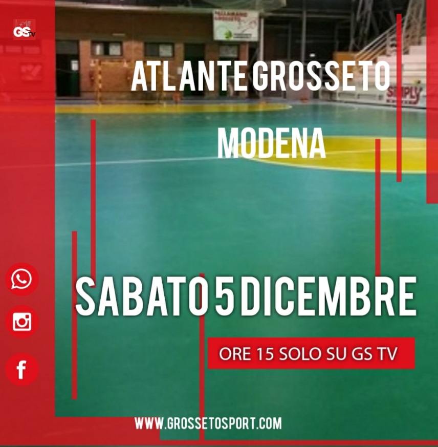 Torna questo pomeriggio la diretta di gs TV con il calcio a 5. In diretta dal Palabombonera di Grosseto il match tra Atlante Grosseto e Modena Cavezzo che sarà visibile sul canale you tube GS TV e su Facebook. Cronaca di Franco Ciardi e riprese di Raffaello Milani.