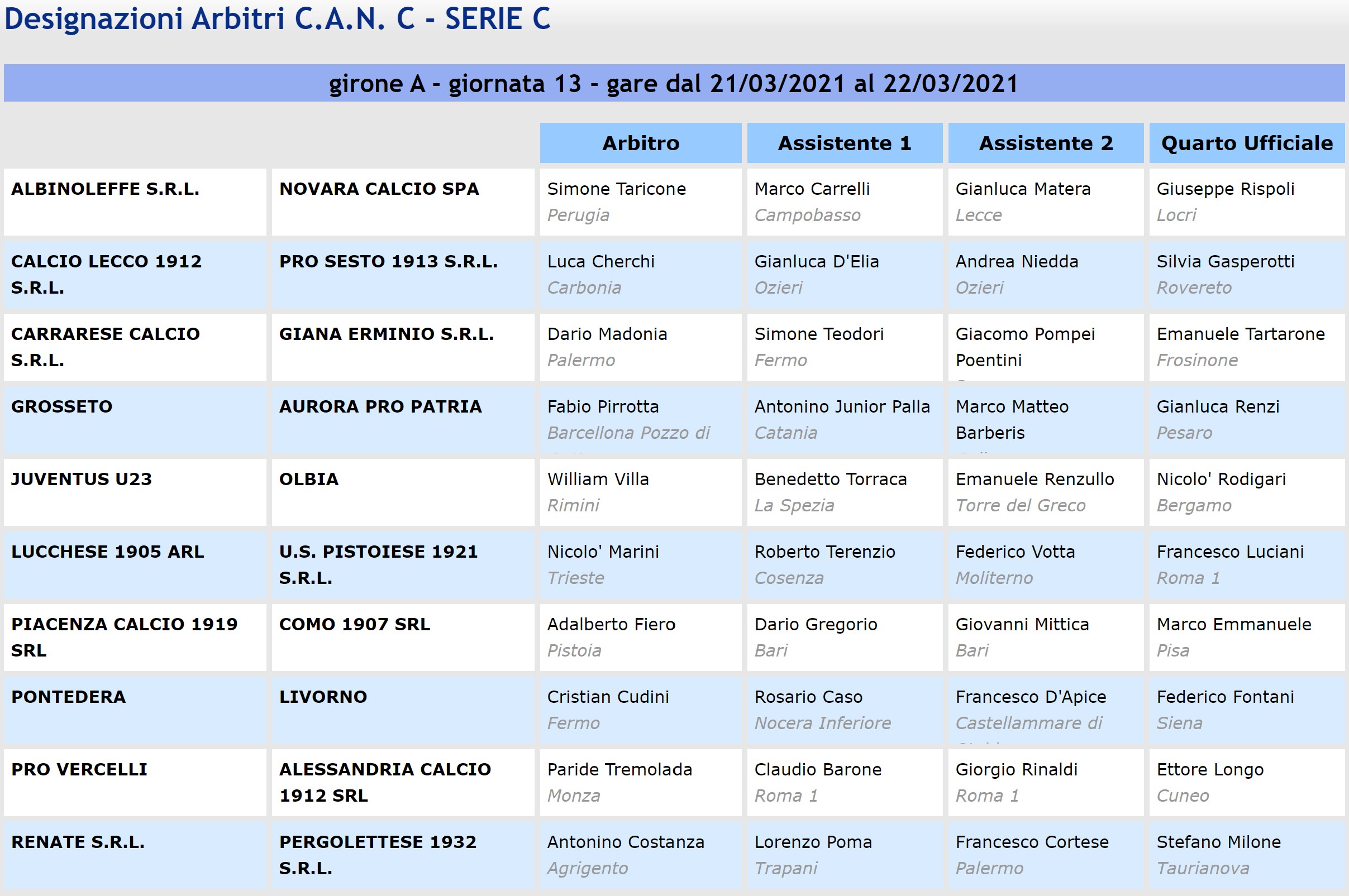 Di seguito, il quadro completo della designazioni arbitrali del girone A.