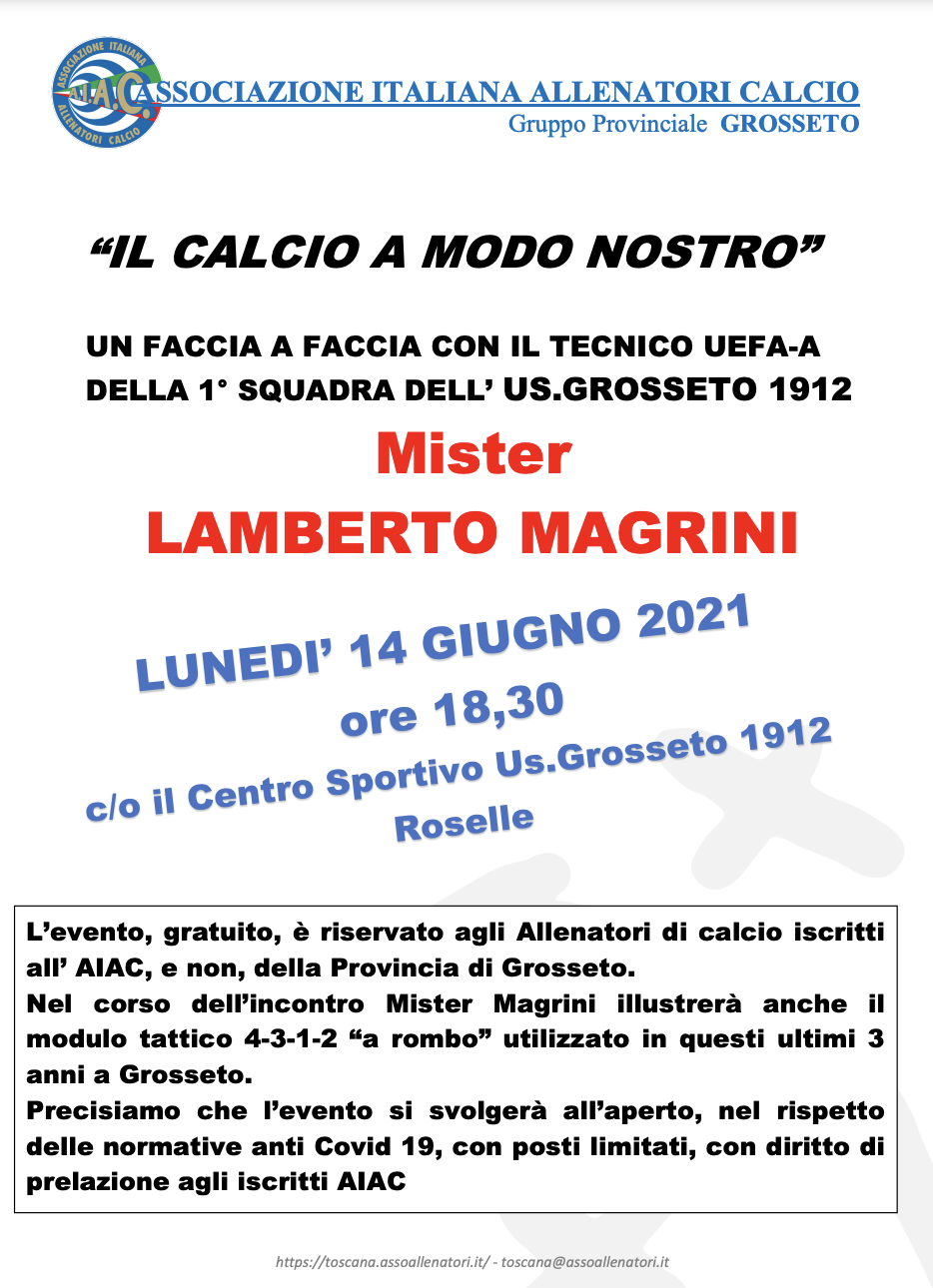 Nell’occasione ci sarà un confronto con i tecnici iscritti alla sezione grossetana e non solo sul modulo 4-3-2-1 a “rombo” utilizzato con ottimi risultati negli ultmi due anni.