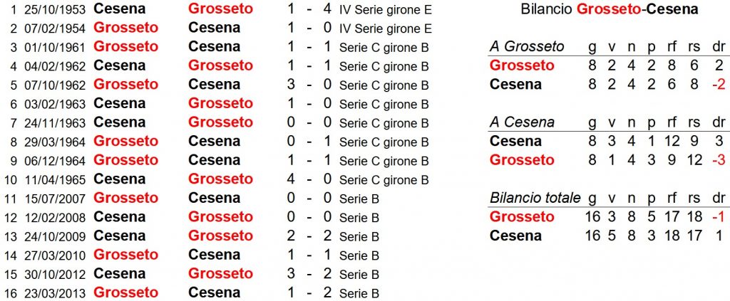 Quello odierno allo Zecchini (7ª giornata di Serie C girone B) sarà il 17° confronto tra Grosseto e Cesena, il 9° in Maremma. Complessivamente, i romagnoli sono avanti con 5 successi, contro i 3 unionisti, mentre i pareggi sono 8, con reti 18 per i bianconeri e 17 per i biancorossi. Per quello che riguarda i confronti a Grosseto, il bilancio è in perfetta parità visto che parliamo di 2 successi a testa e 4 pareggi. Leggero vantaggio maremmano, però, nelle reti: 8 a 6. Il primo lontanissimo confronto tra i due club è avvenuto il 25 ottobre 1953 in IV Serie girone E, a Cesena, con il Grosseto che ha colto l’unico successo esterno contro i romagnoli. Risultato finale roboante, 1 a 4. I biancorossi hanno vinto anche al ritorno (7 febbraio 1954), ma solo per 1 a 0. Dal 1961 al 1965, invece, ci sono stati 8 confronti, tutti in C. Tra questi, da segnalare un 3 a 0 del Grosseto il 7 ottobre 1962 (ultima vittoria biancorossa) e il primo successo romagnolo, per 1 a 0, il 3 febbraio 1963. L’ultima partita in C, poi, ha visto la vittoria per 4 a 0 del Cesena l’11 aprile 1965. Comunque, il bilancio in parità si è spostato in favore dei bianconeri da quando i due sodalizi si sono ritrovati, 42 anni dopo, in Serie B. Infatti, in 6 confronti in cadetteria, i pareggi sono stati 4, mentre 2 sono state le vittorie cesenati, l’ultima delle quali, per 1 a 2 il 23 marzo 2013 (video più in basso). Dunque, Grosseto e Cesena si ritrovano oggi dopo oltre 8 anni, ma in Serie C.