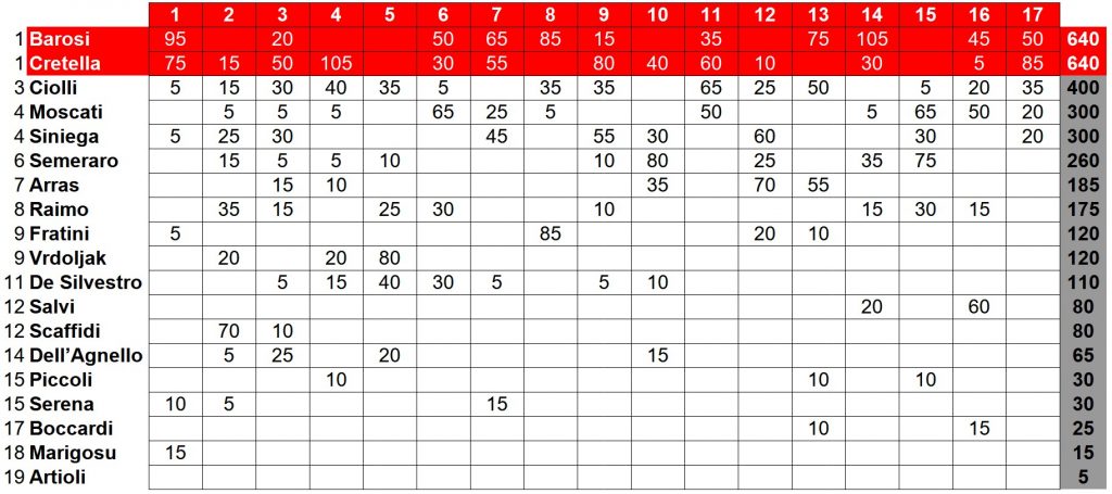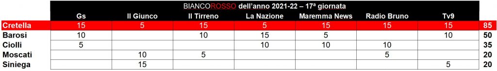 Cretella ritrova il successo nella 17ª giornata del premio Biancorosso dell’anno “Elettromeccanica Moderna” davanti a Barosi e Ciolli e riconquista la vetta della classifica generale a distanza di una settimana, ma in coabitazione. Infatti, mentre il forte centrocampista ha ottenuto 85 punti settimanali, Barosi ne ha ricevuti 50 e così i due si sono ritrovati appaiati in testa in classifica generale a quota 640. Curiosamente, poi, i cinque giocatori votati dalla stampa locale dopo Us Grosseto-Pescara 1 a 2 di domenica scorsa sono anche i primi cinque in classifica generale nell’esatto ordine di punteggio. Dunque, oltre a Cretella e Barosi, hanno ottenuto punti Ciolli (35), Moscati (20) e Siniega (20). In virtù di ciò, Ciolli ha mantenuto il terzo posto assoluto ed è salito a 400 punti, mentre Moscati e Siniega, già appaiati in quarta posizione, hanno raggiunto quota 300.
