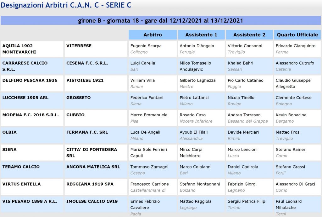 Rese note le designazioni arbitrali della 18ª giornata del girone B di Serie C dove il derby tra Lucchese e Grosseto è stato affidato a Federico Fontani di Siena, il quale sarà coadiuvato da Pietro Lattanzi di Milano e da Nicola Tinello di Rovigo, mentre il quarto ufficiale sarà Clemente Cortese di Bologna. Il fischietto senese non ha mai diretto il Grosseto, né la Lucchese e in questa stagione ha arbitrato 8 incontri tra Serie C (gironi A, B e C) e Primavera (1 e 2) nei quali ha comminato 40 cartellini gialli (media 5 a incontro), 1 rosso per doppia ammonizione e ha assegnato 3 calci di rigore. Come quarto ufficiale, invece, è stato presente in Pontedera-Grosseto 0 a 0 dello scorso campionato di Serie C girone A.