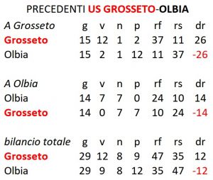 Quella di domani, 19 dicembre, sarà la 29ª sfida in campionato tra le due formazioni, 30ª considerando il match di play-off (conteggiato nel bilancio complessivo). Il Grosseto vanta 12 successi contro gli 8 olbiesi (7 senza la partita di play-off), mentre i pareggi sono stati 8. Nettamente avanti i biancorossi anche nella differenza reti con 47 gol realizzati e 35 subiti. Il Grifone, però, non ha mai vinto a Olbia, mentre i bianchi hanno espugnato 2 volte lo stadio maremmano (1 della quali ai play-off). A Grosseto il bilancio parla di 15 incontri, con 12 successi biancorossi, 2 sardi e 1 pareggio. Il tutto con 37 gol segnati e 11 subiti. Il primo confronto in assoluto tra i due club è avvenuto il 28 dicembre 1947, Olbia-Grosseto 1 a 1 (Serie C girone O). Esistono, poi, 5 precedenti a livello di Coppa Italia dove, a parte 2 pareggi allo Zecchini, i bianchi hanno vinto 2 volte in casa, passando il turno in altrettante circostanze, mentre il Grosseto, nel 2001, ha vinto 11 a 1.