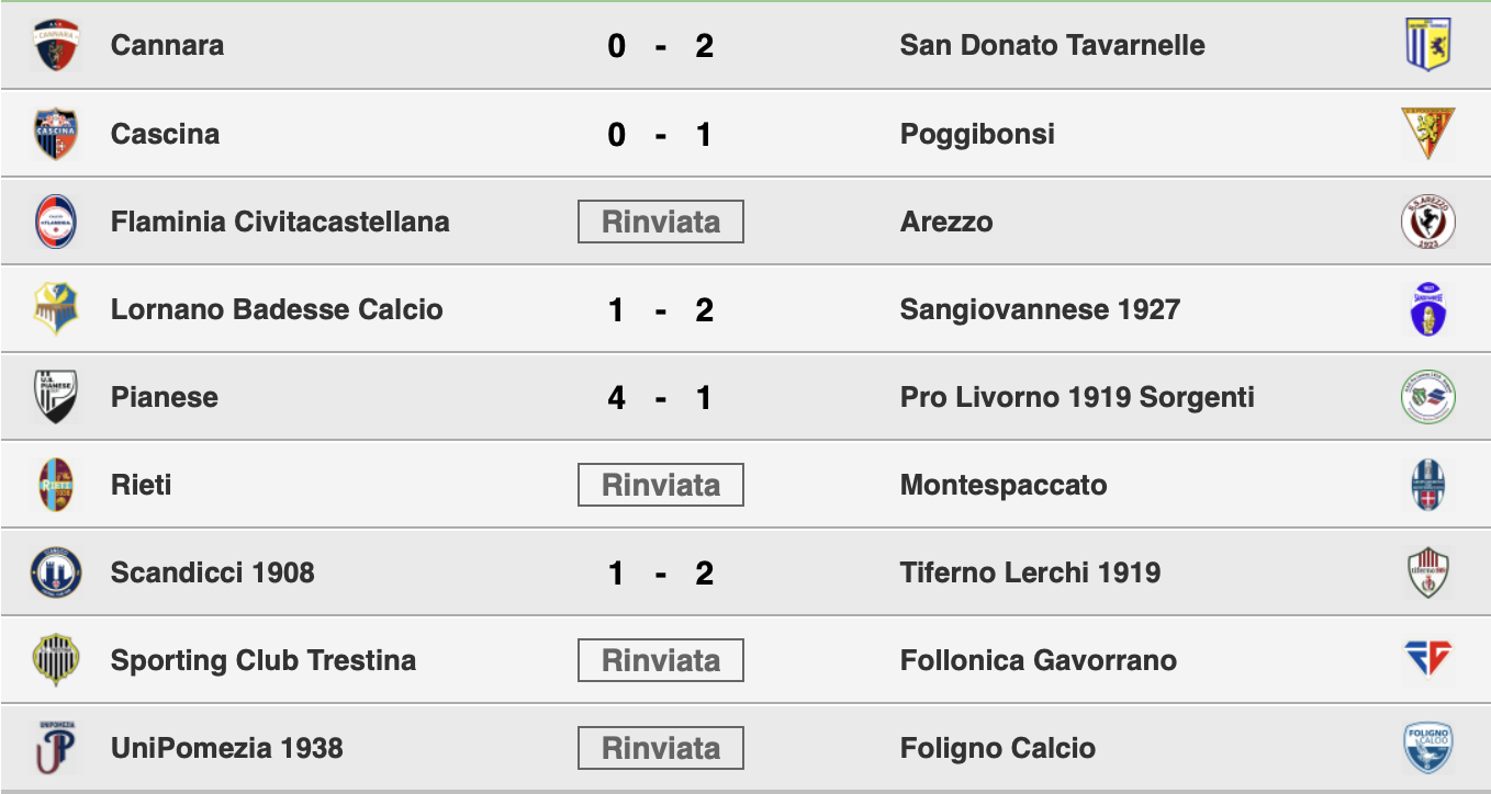 Tra gli altri risultati di giornata da evidenziare a sorpresa la sconfitta interna del Lornano Badesse ad opera della Sangiovannese ed il bel successo della Pianese per 4 a 1 contro la Pro Livorno.