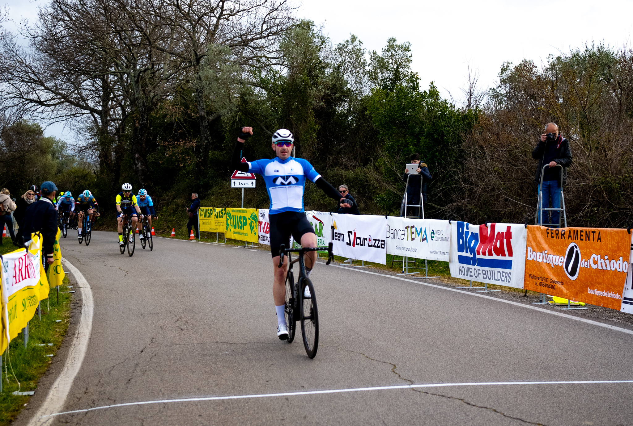 La manifestazione è andata in scesa mercoledì pomeriggio in località Bozzone di Vetulonia con un parterre di primissimo valore tra i 101 cicloamatori che si sono dati battaglia in un anello di nove chilometri sotto l’abitato di Giuncarico da ripetere quattro volte. Poi la carovana dei corridori è transitata per la Castellaccia, Pian Dei Bichi, dritta del Madonnino per poi arrivare a Giuncarico stazione dove c’era l’arrivo, dopo 65 chilometri di gara. La manifestazione è stata organizzata dal Team Marathon Bike con il patrocinio del Comune di Castiglione Della Pescaia e Provincia di Grosseto, in collaborazione con la Uisp , e supportata dalla Banca Tema e dalla Cantina Vini di Maremma di Marina di Grosseto. Nella prima partenza gara controllata dalle squadre laziali della Euronix e della Master Bike, che hanno cercato a più riprese di mandare all’attacco un proprio corridore cosa riuscita alla compagine della Master Bike. Infatti nel corso del secondo giro, attacco deciso Matteo De Santis, capitano di giornata della compagine di Frosinone. L’atleta di Sora (FR) è stato l’autentico mattatore di questa seconda prova con una fuga di oltre 50 chilometri vanificati purtroppo per lui negli ultimi 300 metri, dove il gruppo rinveniva con la vittoria in volata come si diceva di Rosi, su Vincenzo Borzi e Stefano Degl’Innocenti. Per lo sfortunato De Santis solo un quarantasettesimo piazzamento in classifica, e un posto nella storia del Trittico di Maremma per la sua fuga sfortunata. Nella seconda partenza, azione vincente al secondo giro con Roberto Maggioli, Antonio Capotosto e Carlo Socciarelli con un vantaggio sul gruppo che oscillava tra in 20’ e i 30 secondi. Niente da fare per il gruppo che non ce la faceva a colmare il vantaggio. Quinti i tre fuggitivi si contendevano la vittoria con Antonio Capotosto che si imponeva su Roberto Maggioli e Carlo Socciarelli compagno di squadra del vincitore. La volata di gruppo andava a Stefano Ferruzzi su Daniele Macchiaroli e Gianni Bonamici. La terza e ultima tappa andrà in scena mercoledì 30 marzo con partenza dal Bozzone con due classici giri delle strette da fare ma con l’emozionante finale che porterà i corridori nei pressi della Tomba del Diavolino di Vetulonia dopo due chilometri di salita dal versante di Buriano. In testa alla classifica a punti di questa classica è Carlo Socciarelli con 20 punti. In lizza per il primo posto c’è anche un atleta del Marathon Bike, Marco Giacomi con 17 punti.