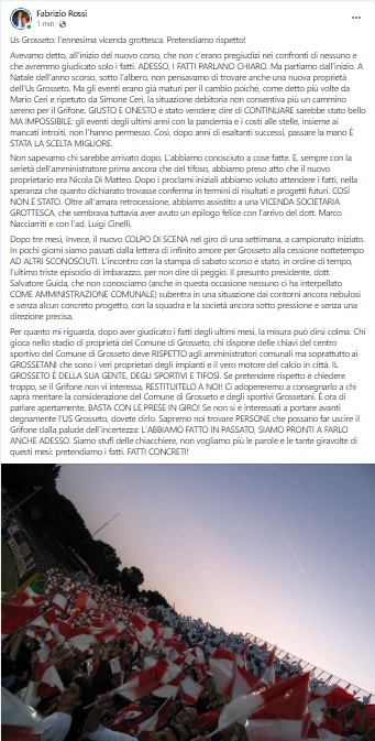 Per quanto mi riguarda, dopo aver giudicato i fatti degli ultimi mesi, la misura può dirsi colma. Chi gioca nello stadio di proprietà del Comune di Grosseto, chi dispone delle chiavi del centro sportivo del Comune di Grosseto deve RISPETTO agli amministratori comunali ma soprattutto ai GROSSETANI che sono i veri proprietari degli impianti e il vero motore del calcio in città. IL GROSSETO È DELLA SUA GENTE, DEGLI SPORTIVI E TIFOSI. Se pretendere rispetto è chiedere troppo, se il Grifone non vi interessa, RESTITUITELO A NOI! Ci adopereremo a consegnarlo a chi saprà meritare la considerazione del Comune di Grosseto e degli sportivi Grossetani. È ora di parlare apertamente, BASTA CON LE PRESE IN GIRO! Se non si è interessati a portare avanti degnamente l’US Grosseto, dovete dirlo. Sapremo noi trovare PERSONE che possano far uscire il Grifone dalla palude dell’incertezza: L’ABBIAMO FATTO IN PASSATO, SIAMO PRONTI A FARLO ANCHE ADESSO. Siamo stufi delle chiacchiere, non vogliamo più le parole e le tante giravolte di questi mesi: pretendiamo i fatti. FATTI CONCRETI!