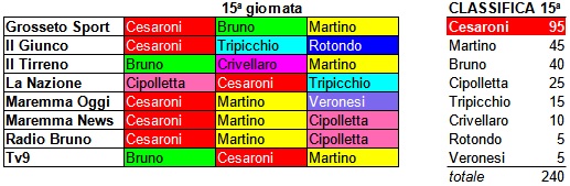 15ª GIORNATA (Us Grosseto-Terranuova Traiana 1 a 0) – CLASSIFICHE SETTIMANALE E GENERALE