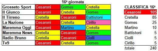 16ª GIORNATA (Us Pianese-Us Grosseto 1 a 1) – CLASSIFICHE SETTIMANALE E GENERALE