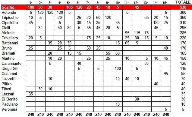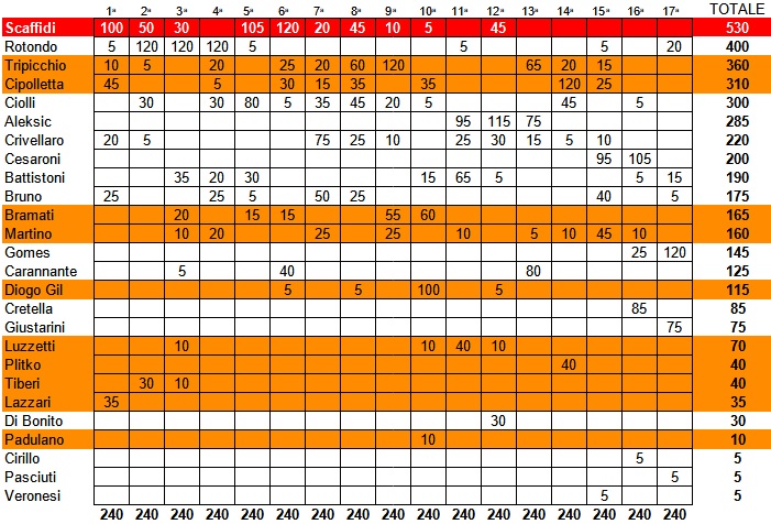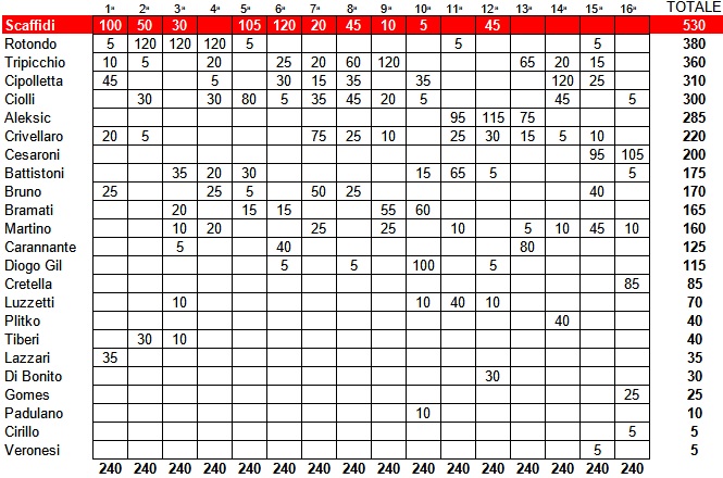 Partita scoppiettante quella tra Us Grosseto e Ghiviborgo, terminata col rocambolesco risultato di 4 a 4. Vincitore settimanale, con 120 punti, è risultato Gomes, autore di due gol e di una prestazione sontuosa, da attaccante fuori categoria. Dietro di lui l’esordiente Giustarini, il quale ha realizzato il gol del momentaneo 3 a 3 e ha ottenuto 75 punti. Terzo, poi, Rotondo, con 20 punti, tornato al gol dopo 13 giornate. Per l’attuale capocannoniere biancorosso, una rete, quella del temporaneo 4 a 3, che ha illuso tutti in pieno recupero finale (durato ben 8′) prima del pari ospite all’ultimo respiro. Votati anche Battistoni (15 punti), Bruno (5) e il neo-acquisto Pasciuti (5), giocatore di grande esperienza e qualità. In classifica generale sono così diventati ben 26 gli unionisti presenti, ma di questi ben 10 (evidenziati in arancione nell’apposita immagine) hanno nel frattempo lasciato il Grosseto per accasarsi altrove durante la sessione di autunnale di calciomercato. Comunque, leader assoluto con i suoi 530 punti continua ad essere Scaffidi (a secco da cinque turni), 130 in più di Rotondo, salito a 400. Buona crescita, poi, di Gomes, arrivato a 145 punti, tredicesimo assoluto dopo due presenze, mentre Giustarini, con i suoi 75 punti, si è assestato subito in diciassettesima posizione.
