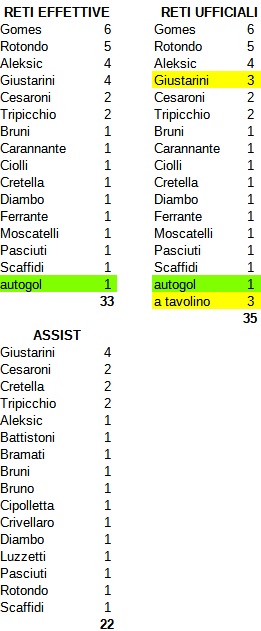 Insomma, le reti effettivamente realizzate dagli unionisti sono state 33 (32 più 1 autorete), ma il gol del pareggio di Giustarini a San Giovanni è stato cancellato dallo 0 a 3 a tavolino, pertanto il conteggio ufficiale porta il totale dei gol biancorossi a 35.