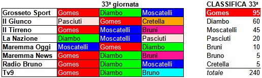 Nella 33ª giornata (penultima) di campionato, il Grifone ha pareggiato 1 a 1 con la Pianese e la stampa grossetana, chiamata a votare per il premio Biancorosso dell’anno “Elettromeccanica Moderna”, ha votato Gomes come migliore della settimana assegnandogli 95 punti. Dietro di lui, Diambo con 60 punti e Moscatelli con 45. Infine, 20 punti per Pasciuti, 10 per Bruni e 5 a testa per Bruno e Cretella.