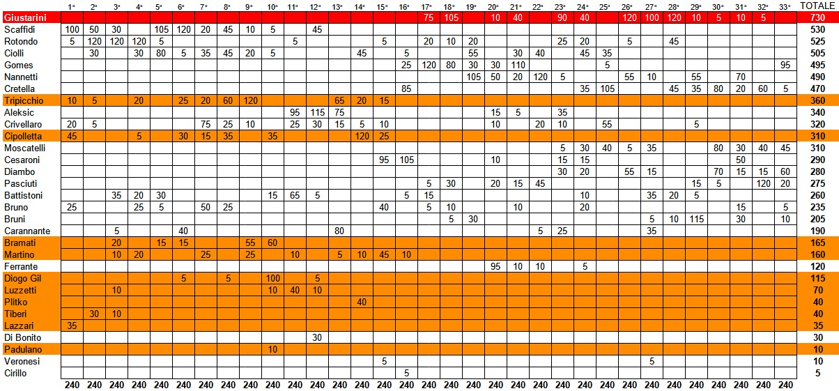 CLASSIFICA GENERALE A livello assoluto, c’è l’affermazione definitiva di Giustarini (in foto) che si aggiudica il titolo di Biancorosso dell’anno “Elettromeccanica Moderna” 2022-2023 con un turno di anticipo grazie ai suoi 730 punti complessivi. Questo, nonostante domenica scorsa, “Birillo”, come soprannominato dagli amici, non abbia ricevuto punti dalla giuria giornalistica. Per Giustarini si tratta di un successo meritatissimo, soprattutto se si pensa che il ragazzo è arrivato in biancorosso solo alla 17ª giornata (Us Grosseto-Ghiviborgo 4 a 4). A questo punto, restano da assegnare il 2° e il 3° posto, che coincideranno con altrettanti riconoscimenti. Al momento, Scaffidi (autore di un’ottima prima parte della stagione, salvo sparire a partire dalla 13ª giornata) è secondo con 530 punti, appena 5 in più di Rotondo, infortunato. Al quarto posto, invece, troviamo Ciolli che ha 495 punti, il quale, però, ha perso il posto da titolare negli ultimi due turni. Aritmeticamente parlando, Ciolli può ancora ambire alla seconda e alla terza piazza, così come sono in piena corsa Gomes (495 punti), quinto, Nannetti (490) e Cretella (470). Tutti gli altri, invece, potranno solo cercare di migliorare i propri piazzamenti conclusivi. Infine, da notare la crescita in questo finale di stagione da parte di Moscatelli (310 punti) e di Diambo (280).