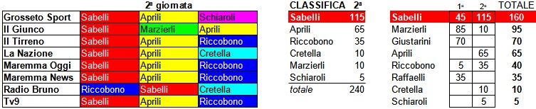 Infine, quarti a pari merito, Cretella e Marzierli con 10 punti e quinto Schiaroli con 5.