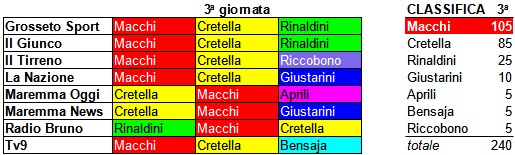 Domenica scorsa, il successo per 2 a 1 del Grosseto sul Seravezza ha portato la stampa grossetana ad assegnare a Macchi, autore dello splendido gol-vittoria, 105 punti valevoli per il premio Biancorosso dell’anno “Elettromeccanica Moderna”. Tuttavia, su chi sia stato il migliore di giornata non c’è stata unanimità, visto che Grosseto Sport, Il Giunco, Il Tirreno, La Nazione e Tv9 hanno indicato proprio Macchi. Al contrario, Maremma Oggi e Maremma News ha scelto Cretella, mentre Radio Bruno il funambolico Rinaldini. Alla fine, come detto, 105 punti per Macchi, 85 per Cretella e 25 per Rinaldini. Al quarto posto, invece, Giustarini con 10 punti, mentre hanno chiuso la classifica settimanale Aprili, Bensaja e Riccobono con 5 punti a testa.