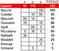 CLASSIFICA GENERALE Nonostante l’infortunio che lo terrà lontano per un po’ dal terreno di gioco, primo assoluto è ancora Sabelli con i suoi 160 punti, mentre secondo è diventato Macchi grazie ai suoi 105 punti. Cretella, invece, ha agganciato a quota 95 bomber Marzierli, mentre Giustarini, Aprili e Riccobono hanno mosso piccoli passi portandosi rispettivamente a 80, 70 e 45 punti. Da notare come adesso gli unionisti presenti in classifica generale siano diventati 11, grazie all’ingresso di Macchi, Bensaja e Rinaldini, votati per la prima volta.