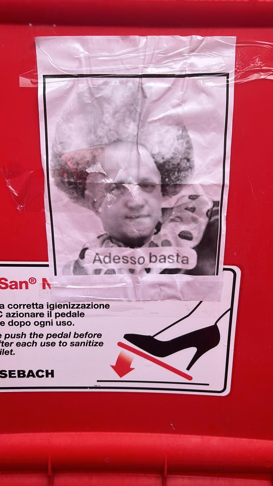 Un fotomontaggio con la faccia da clown stampato e messo nel bagno degli ospiti del “Malservisi Matteini” di Bagno di Gavorrano.