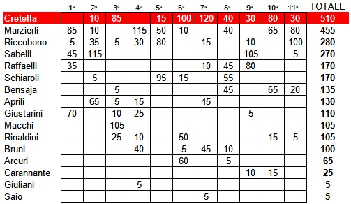 CLASSIFICA GENERALE A livello di classifica generale il turno appena trascorso ha lasciato Cretella in testa a 510 punti, ma Marzierli gliene ha mangiati 50, portandosi a quota 455. Riccobono, invece, è salito sul podio con 280 punti, scavalcando Sabelli giunto a 270.