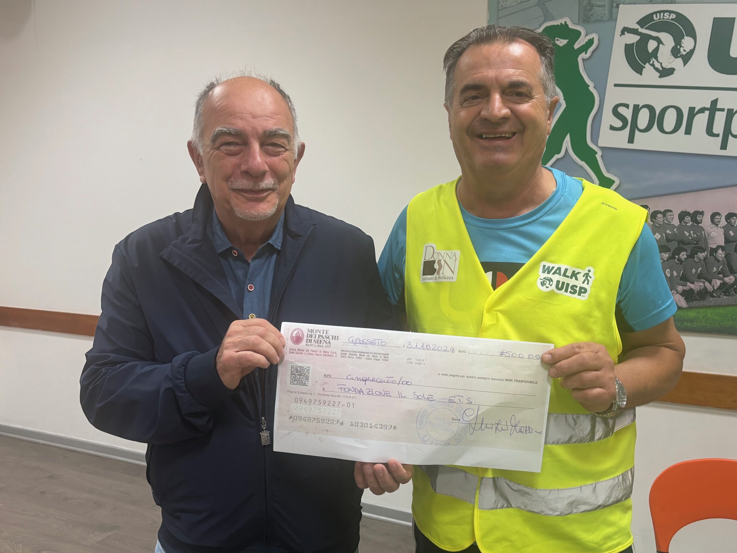 Si è svolta giovedì 31 ottobre, nella sala intitolata a Osvaldo Faenzi, la consegna dell’assegno da 500 euro da parte del gruppo Walk Uisp alla Fondazione Il Sole, un gesto che tutti gli anni i camminatori indirizzano ad una delle associazioni che operano sul territorio.