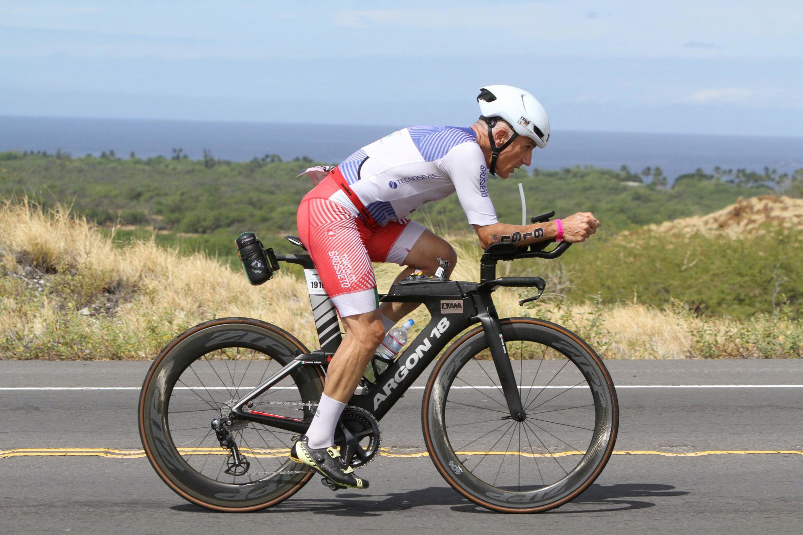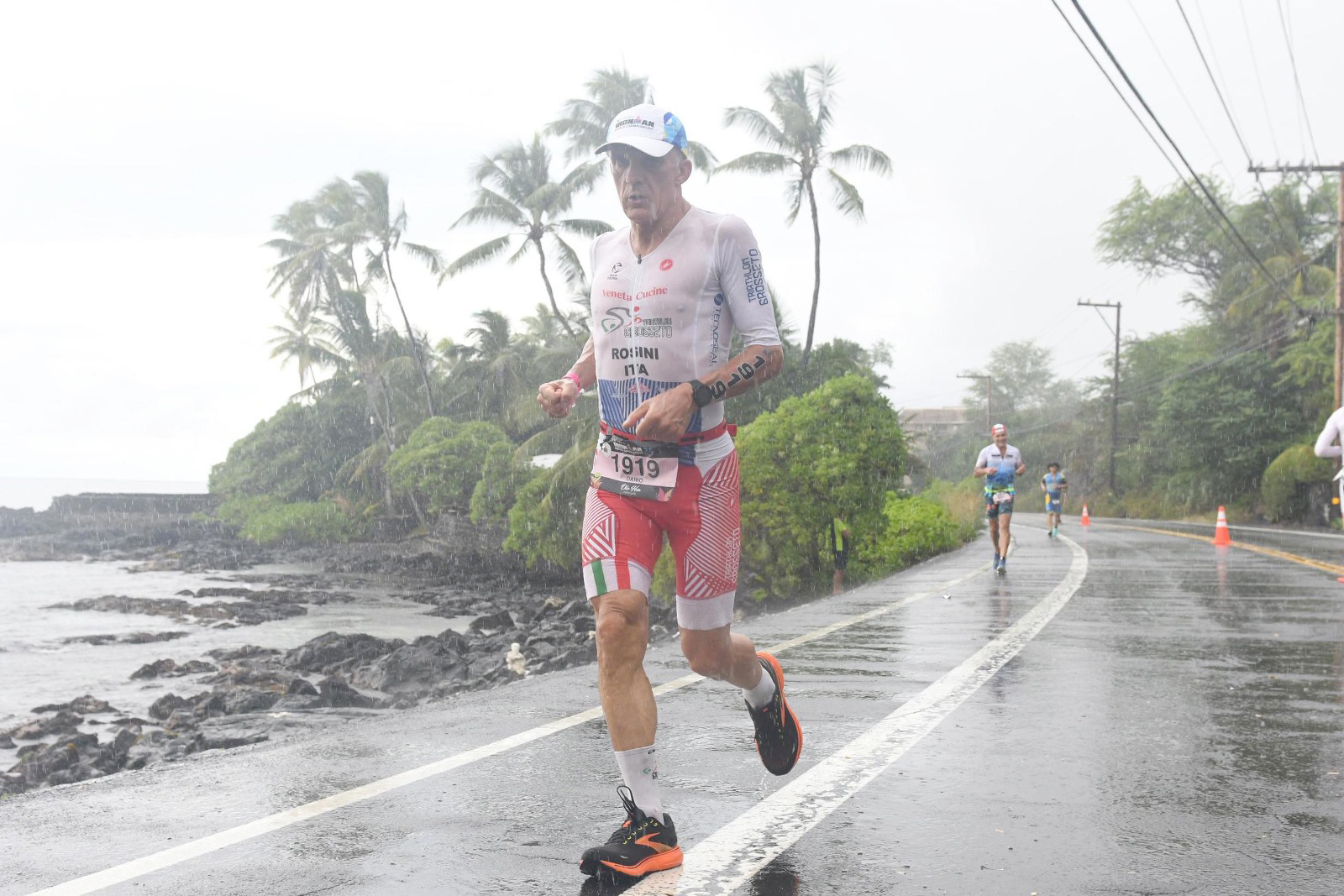 Ma l’epopea era appena cominciata. Appena giunto in zona cambio, Rosini ha dovuto combattere le emozioni e i timori di una gara che, già alla vigilia, sembrava voler metterlo alla prova con sintomi influenzali e una ferita al piede destro, causata da una caduta accidentale del pedale. Ma nulla poteva fermarlo: con l’aiuto di un medico giapponese, ha coperto la ferita e si è lanciato sulla sua bici per affrontare la leggendaria “Queen Ka’ahumanu Highway,” una strada dove il vento soffia come una forza primordiale, costringendo anche i migliori a inchinarsi al suo volere. Dario ha spinto per 180 km, 1700 metri di dislivello, il vento a sfidare ogni pedalata e la temperatura bollente di 28 gradi a fare da incudine sui suoi muscoli.