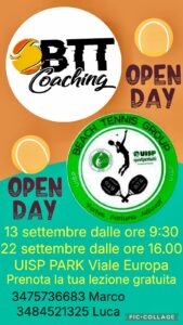 Due open day sono in programma nella tensostruttura di viale Europa: sabato 13 settembre dalle ore 9,30 e lunedì 22 settembre dalle ore 16.  E’ possibile prenotare una lezione gratuita per avvicinarsi a questa attività con gli istruttori della Btt Coaching e del Beach Tennis Group Uisp. Per informazioni 3666433092, 3475736683, 3484521325.