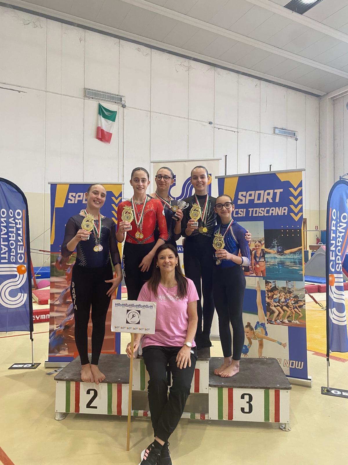 Domenica scorsa si è tenuta a Rosignano la prima prova del campionato regionale individuale CSI di categoria super A a cui la Polisportiva Barbanella ha preso parte scendendo in pedana con 5 giovanissime atlete che hanno dato spettacolo in tutte le categorie. In questo campionato, le ginnaste hanno la possibilità di sfidarsi su quattro attrezzi (parallele, volteggio, trave e corpo libero) più la specialità del trampolino, sperimentando così nuovi elementi ginnici e acrobatici. Ad aprire le danze è Alessia Lori, classe 2011, che con 5 prove perfette su 5 sale sul primo gradino del podio sia nella classifica assoluta che nella specialità .minitrampolino nella categoria junior. Nelle allieve, 11 anni, ottima la prova di Perla Girelli che vince la medaglia d’oro sia nella classifica assoluta che al mini trampolino. Passando alla categoria ragazze, medaglia d’argento per Daria Pezzuto e bronzo per Giulia Lori nella classifica assoluta. Podio tutto della polisportiva grossetana per la specialità del mini trampolino con Petra Parmesani oro, seguita da Giulia Lori, argento, e Daria pezzuto, bronzo. L’ allenatrice Claudia Salvadore si ritiene molto felice della prestazione delle proprie atlete che hanno dimostrato ottima preparazione ma anche un ottima tenuta di gara. Al termine della pausa Pasquale le atlete scenderanno di nuovo in pedana con la seconda prova dei campionati regionali CSI medium large e super e con le gare di federazione a squadre.